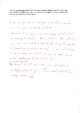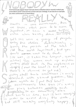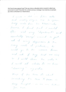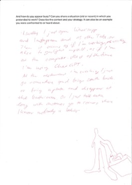 How to appear busy is a workshop focusing on the specific skills required to pretend to be busy. While looking at different strategies, ranging from active sabotage to everyday coping mechanisms, we will share personal experiences and knowledge on the act of performing work.